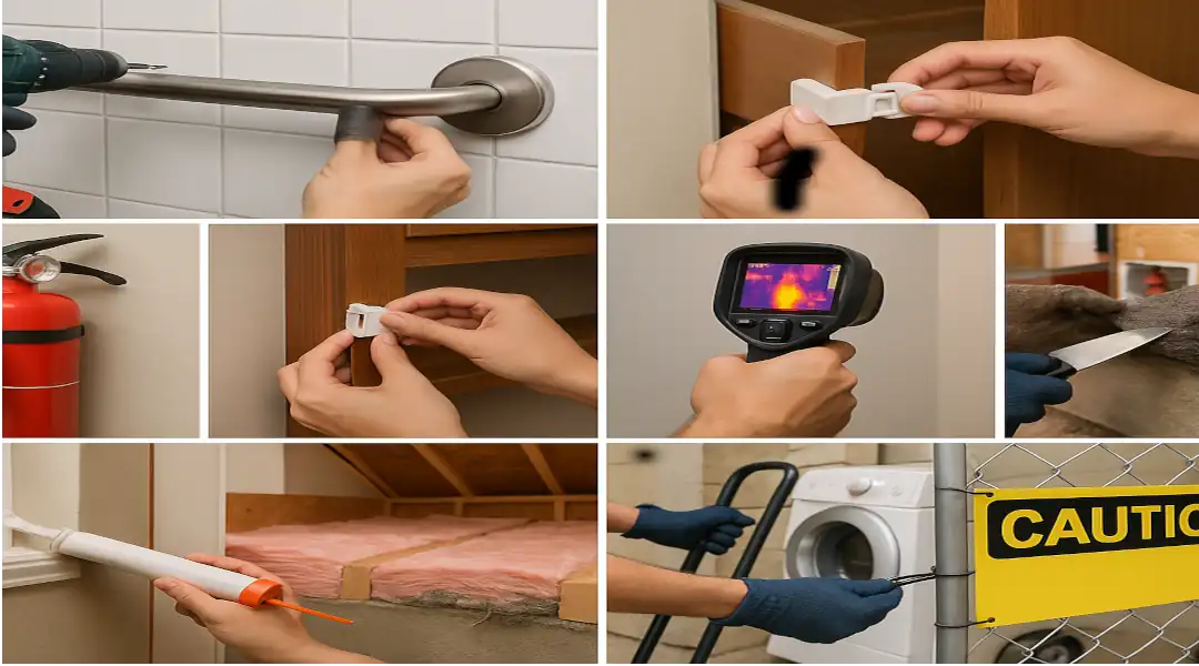 Grab bars, child-proof latches, fire-extinguisher, rodent proofing, attic insulation, seasonal weatherproofing, appliance haul-away, thermal imaging, event signage/fencing