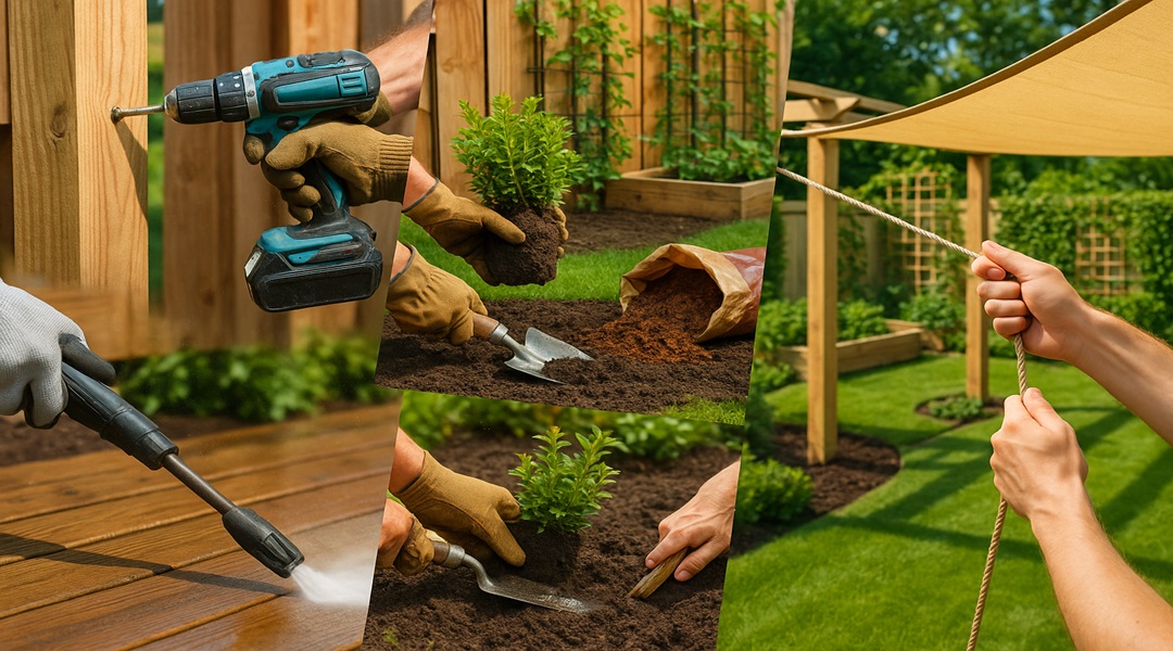 Deck/fence repair, pergolas, shade sails, raised beds, trellises, hedging/planting, pressure-washing paths & siding, seasonal mulch refreshes and edging.
